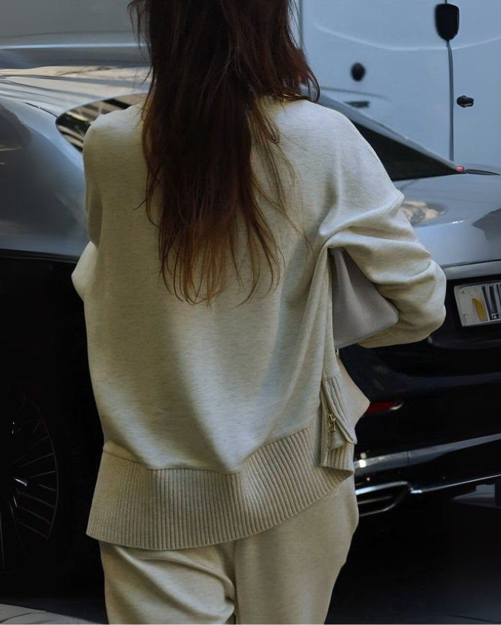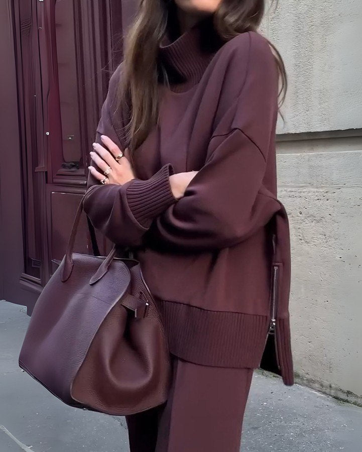 Descubre Ariana™, un conjunto de dos piezas que combina diseño contemporáneo con la calidez que necesitas esta temporada. Su suéter de cuello alto con cremallera lateral y pantalones de corte amplio crean una silueta fluida y sofisticada, ideal para días casuales o encuentros más formales.