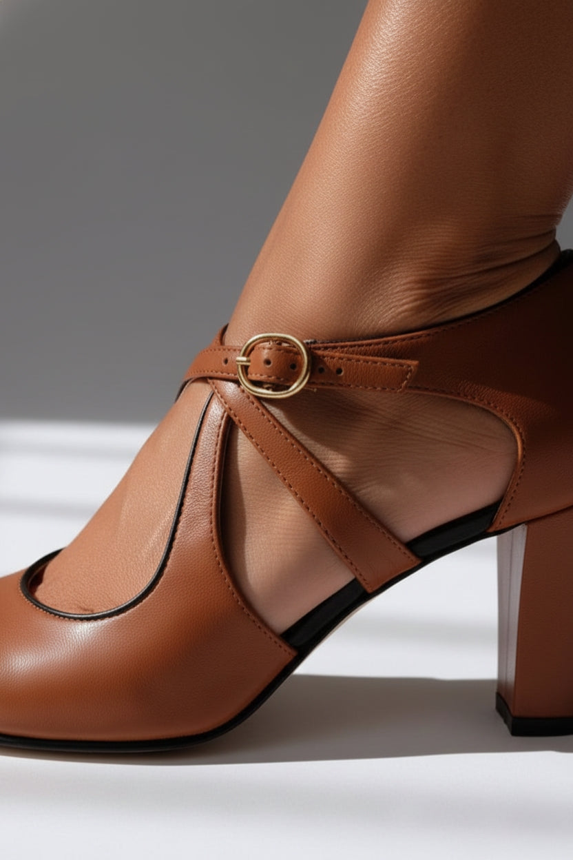 Hay una elegancia sencilla en la forma en que este zapato se mueve contigo. El cálido tono marrón y las suaves líneas curvas crean un aspecto pulido, perfecto para mañanas tranquilas o para salir durante el día. El tacón bloque y la delgada correa cruzada proporcionan una sensación segura y equilibrada con cada paso.